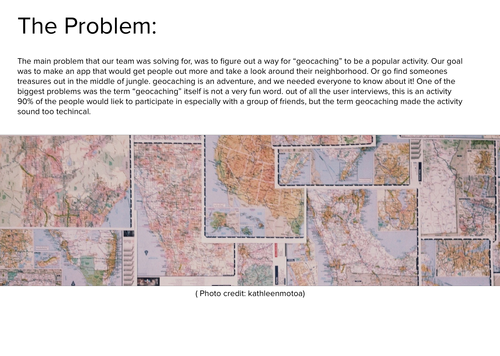 Rand McNally, a world renowned atlas company has been wanting to branch out and stay more relevant in a digital age. My team and I were given the task to evaluate the geocaching market, and to devise a mobile app to compete with the current market.
